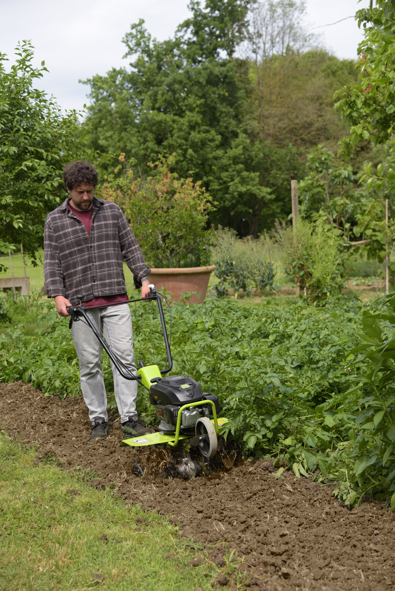 Die 4-Stern-Fräse arbeitet bis zu 28 cm tief bei einer Drehzahl von bis zu 155 U/min und eignet sich sowohl für weiche als auch für kompakte Böden. Die aktive Kupplung ermöglicht das Starten und Stoppen der Messerrotation mit einer einfachen Bewegung, während der Motor stets läuft.
